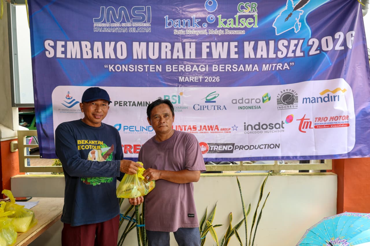 JURNALKALIMANTAN.COM, BANJARMASIN – Antusiasme warga membludak saat kegiatan sembako murah yang digelar oleh Forum Wartawan Ekonomi Kalsel (FWE) kembali hadir di bulan Ramadan. Berkolaborasi dengan Jaringan Media Siber Indonesia Kalsel (JMSI), kegiatan ini sukses digelar di Komplek Andai Jaya Persada Blok F No 5 RT 34, Kelurahan Sungai Andai, Kecamatan Banjarmasin Utara, Senin (2/3/2026).