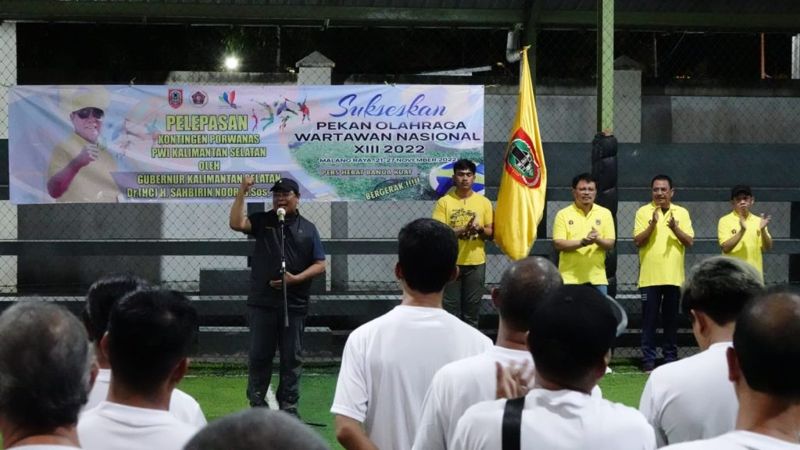 JURNALKALIMANTAN.COM, BANJARMASIN- Gubernur Kalsel Sahbirin Noor atau Paman Birin melepas resmi kontingen atlet Persatuan Wartawan Indonesia (PWI) Kalsel dalam ajang Pekan Olahraga Wartawan (Porwanas) pada Selasa (15/11/2022) malam.