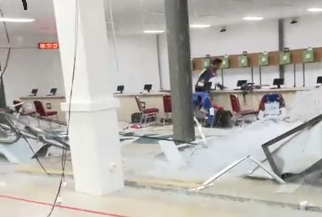 Hal tersebut terlihat dalam sebuah tayangan video yang menampilkan saat para atlet tembak sedang berlomba, tiba-tiba bagian bangunan arena mengalami ambruk.