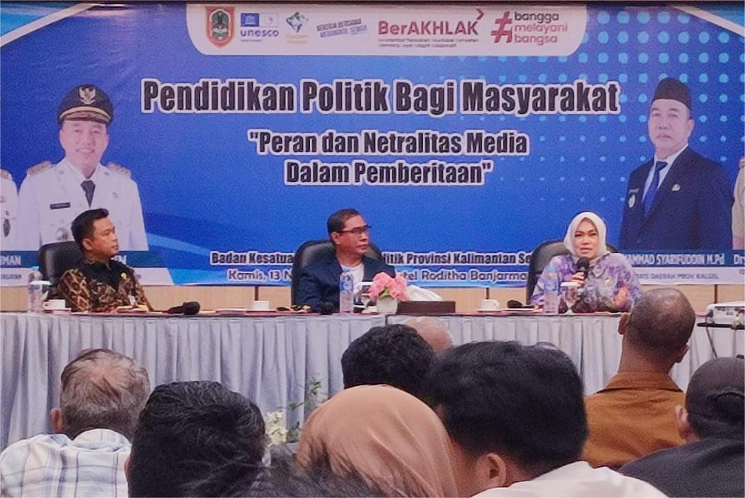 JURNALKALIMANTAN.COM, BANJARMASIN – Dalam upaya memperkuat peran media sebagai salah satu pilar demokrasi, Badan Kesatuan Bangsa dan Politik (Bakesbangpol) Provinsi Kalimantan Selatan (Kalsel) menggelar kegiatan Pendidikan Politik bagi Masyarakat dengan tema “Peran dan Netralitas Media dalam Pemberitaan”, Kamis (13/11/2025), di salah satu hotel di Banjarmasin.