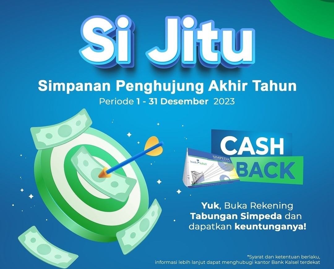 JURNALKALIMANTAN.COM, BANJARMASIN– Bank Kalsel mengajak masyarakat untuk bijak dalam menyimpan dana, dengan ikuti Program Simpanan Penghujung Akhir Tahun (Si Jitu) periode 1-31 Desember 2023. Si Jitu diberikan Bank Kalsel untuk menyambut akhir Tahun 2023 yang akan berganti tahun.