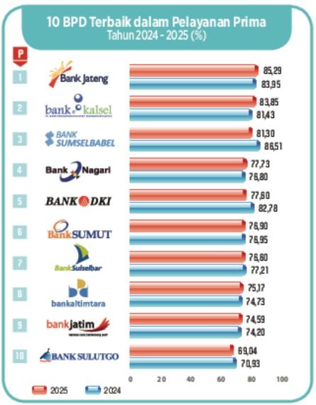Bank Jateng berhasil menempati posisi teratas, diikuti oleh Bank Kalsel yang melesat dari peringkat keempat ke posisi kedua. Sementara itu, Bank Sumsel Babel menempati posisi