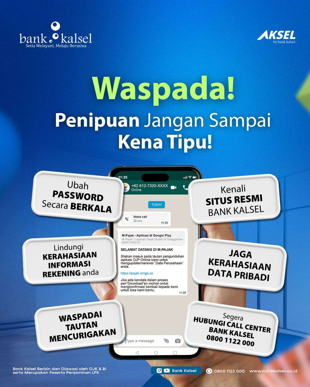 Nasabah juga diminta untuk mengenali dan hanya menggunakan kanal komunikasi resmi Bank Kalsel. Jika menemukan pesan atau permintaan yang mencurigakan, segera laporkan ke Call Center resmi Bank Kalsel di 0800 1122 000.