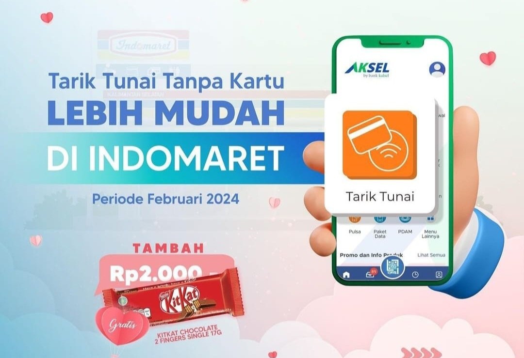 Saatnya mencoba fitur Tarik Tunai Tanpa Kartu di Indomaret Seluruh Indonesia, hanya dengan minimal Tarik Tunai Rp300.000, dan tambah Rp2.000, Anda sudah bisa mendapatkan gratis Kitkat Chocolate 2 Fingers Single 17G.
