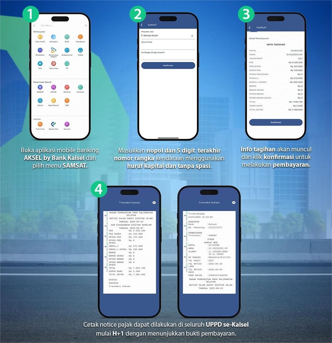Melalui layanan E-Samsat di AKSEL by Bank Kalsel, diharapkan masyarakat semakin dimudahkan dalam memenuhi kewajiban pajak kendaraan secara tepat waktu tanpa harus datang dan mengantre di kantor Samsat.