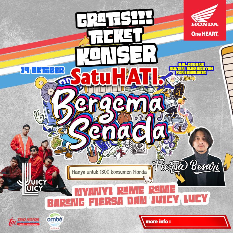 JURNALKALIMANTAN.COM, BANJARMASIN – Trio Motor Kembali hadirkan program spesial. Kali ini, ditawarkan tiket konser gratis untuk para pelanggan Honda yang melakukan pembelian sepeda motor untuk periode 1–13 Oktober 2023. Adapun konsernya akan diadakan pada tanggal 14 Oktober di Halaman Gedung Sultan Suriansyah Banjarmasin, menghadirkan salah satu grup musik ternama asal Indonesia Juicy Luicy, dan musisi ternama Fiersa Besari.