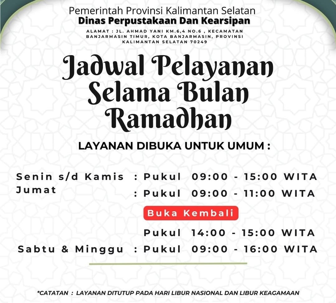 Pelaksana tugas Kepala Dispersip Kalsel Adethia Hailina mengatakan, selama pelaksanaan ibadah puasa ini pihaknya akan menyesuaikan jam operasional.