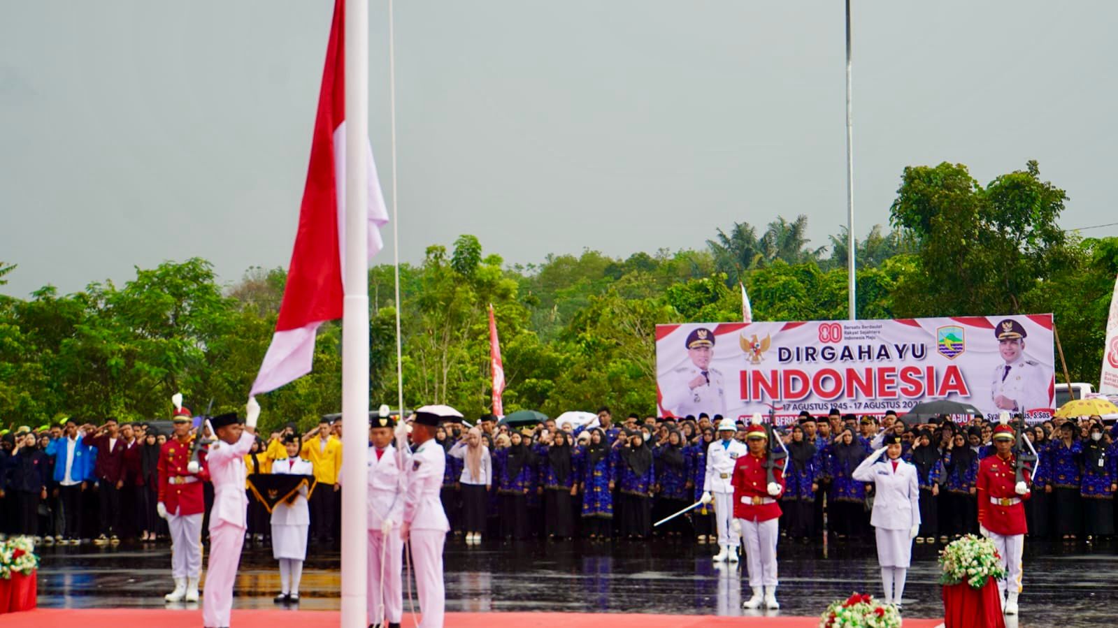 JURNALKALIMANTAN.COM, KOTABARU – Pemerintah Kabupaten (Pemkab) Kotabaru menggelar upacara peringatan Hari Ulang Tahun (HUT) ke-80 Proklamasi Kemerdekaan Republik Indonesia di halaman Kantor Bupati Kotabaru, Minggu (17/8/2025). Upacara berlangsung khidmat dan meriah meski sempat diguyur hujan, dipimpin langsung oleh Bupati Kotabaru H. Muhammad Rusli, S.Sos.