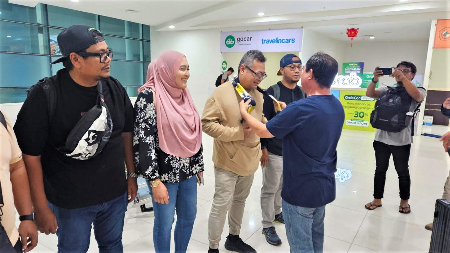 Ketua PWI Kalsel Zainal Helmie bersama perwakilan panitia pusat, menyambut kedatangan enam delegasi tersebut dengan mengalungkan selempang dan topi HPN 2025.