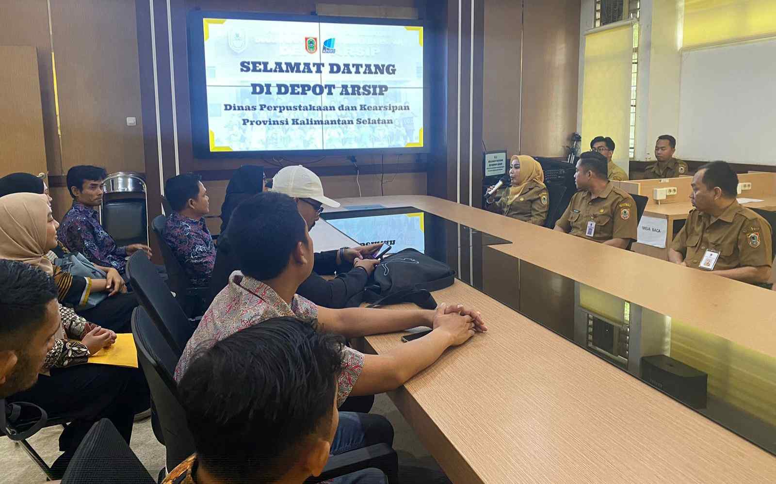 Rombongan diterima langsung Kepala Dispersip Kalsel Hj. Nurliani Dardie, yang mengajak berdiskusi dan melihat langsung pengelolaan arsip pada Depo Arsip Kalsel di Kota Banjarbaru.