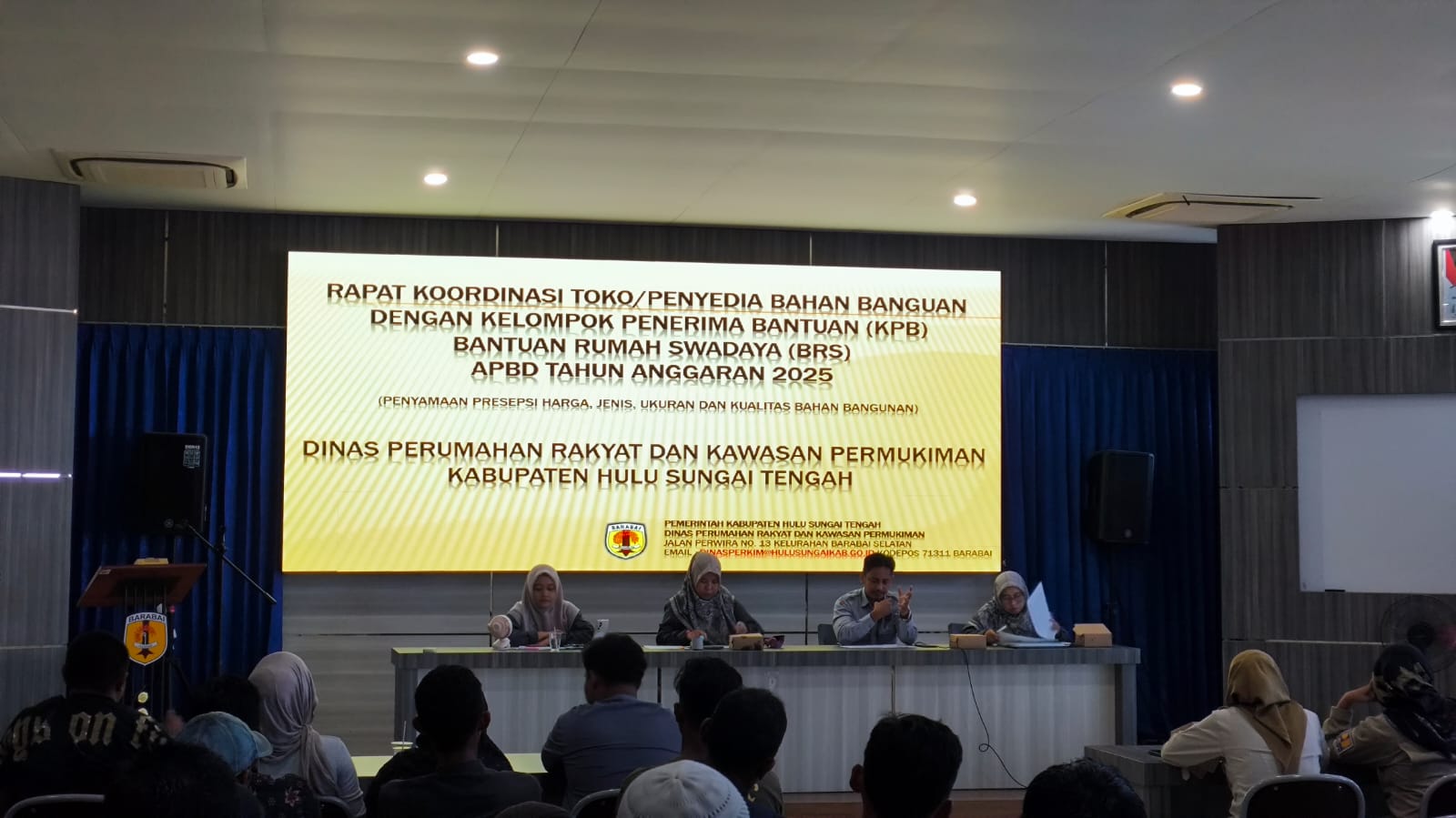 JURNALKALIMANTAN.COM, HULU SUNGAI TENGAH – Dinas Perumahan Rakyat dan Kawasan Permukiman (Disperkim) Kabupaten Hulu Sungai Tengah (HST), Kalimantan Selatan (Kalsel) menggelar rapat koordinasi (rakor) toko/penyedia bahan bangunan dengan kelompok penerima bantuan (KPB) bantuan rumah swadaya (BRS) tahun 2025.
