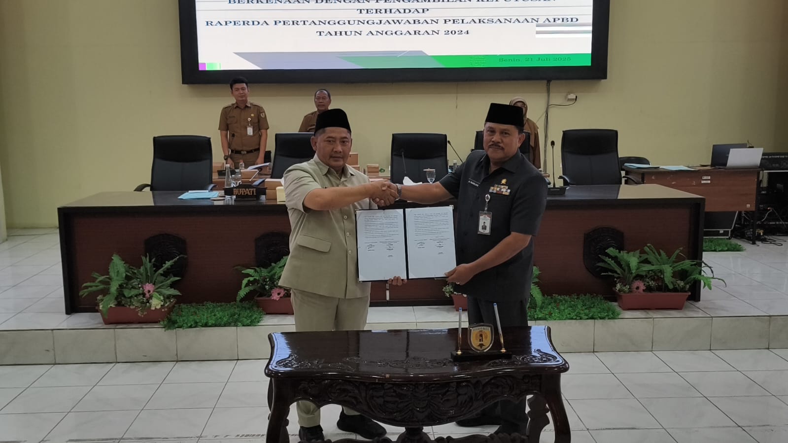 Bupati HST, Samsul Rizal menunjukan dokumen berita acara penyampaian Raperda Pertanggungjawaban Pelaksanaan APBD HST 2024, Senin (21/7/2025) di Gedung DPRD