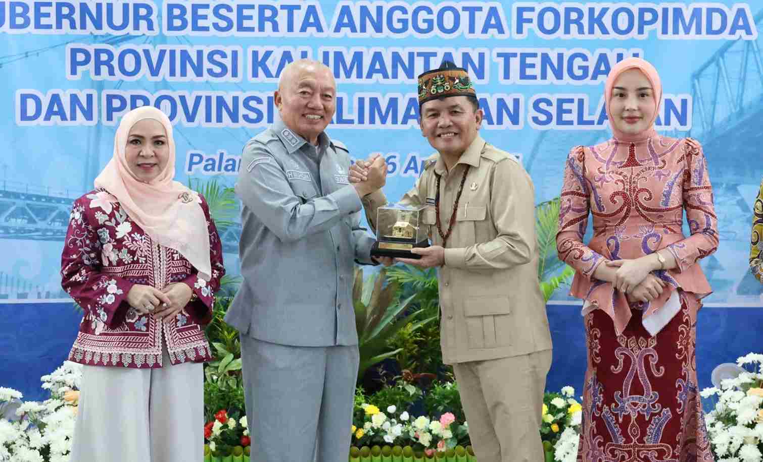 JURNALKALIMANTAN.COM, KALIMANTAN TENGAH – Gubernur Kalimantan Selatan H. Muhidin didampingi istri Hj. Fathul Jannah bersama Forum Koordinasi Pimpinan Daerah (Forkopimda) bersilaturahmi dengan Gubernur Kalimantan Tengah H. Agustiar Sabran dan istri, Aisyah Thisia Agustiar Sabran, di Rumah Dinas Gubernur Kalteng, Palangka Raya, Kamis (16/4/2026).