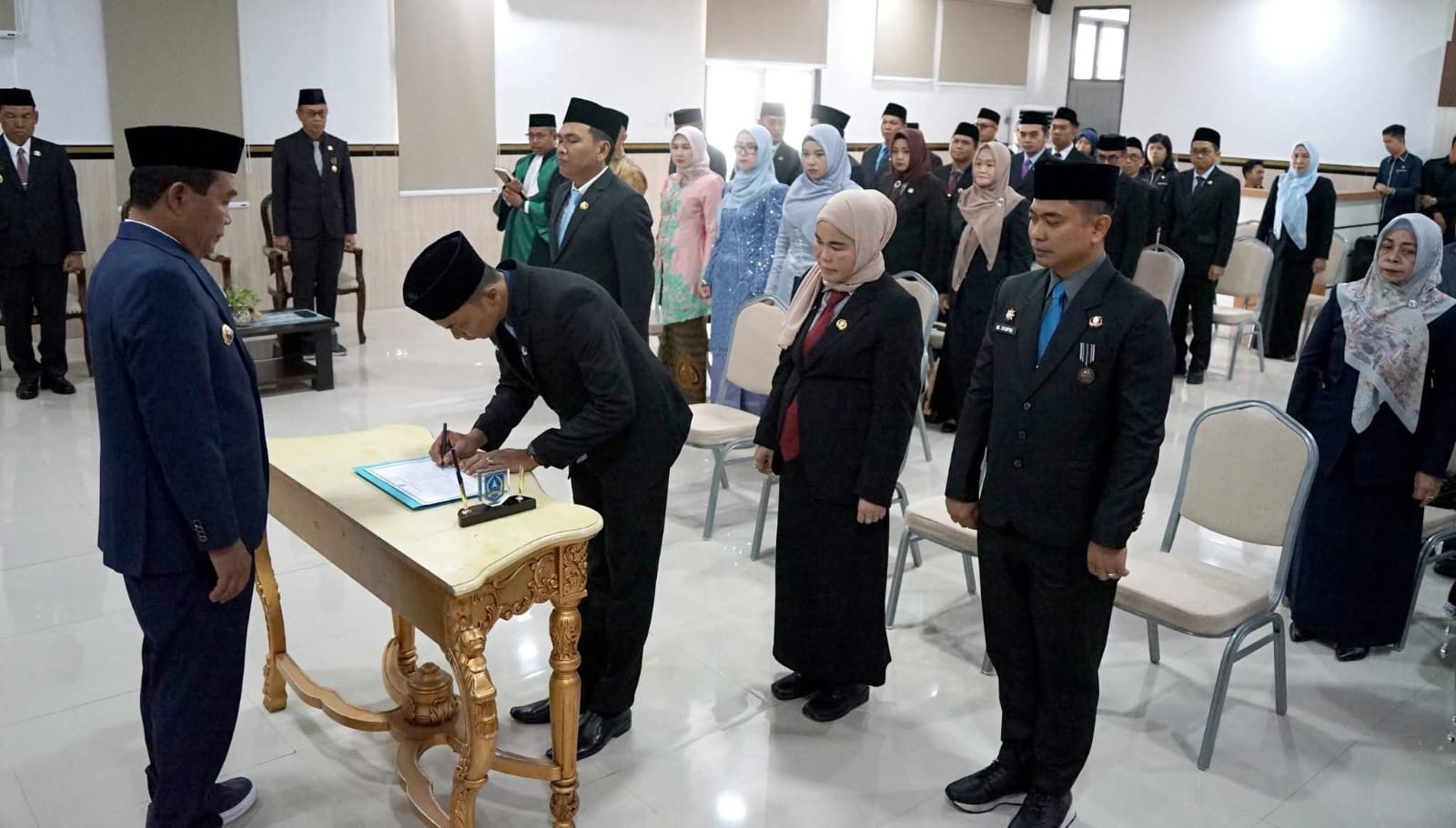 Acara pelantikan dan pengambilan sumpah jabatan berlangsung di Aula Kantor Dinas Kesehatan Kabupaten HSS, Senin (24/11/2025), dihadiri Wakil Bupati H. Suriani, Sekretaris Daerah Drs. H. Muhammad Noor, para Asisten, Staf Ahli, Kepala Perangkat Daerah, Kepala Bagian, serta para Camat se-Kabupaten HSS.