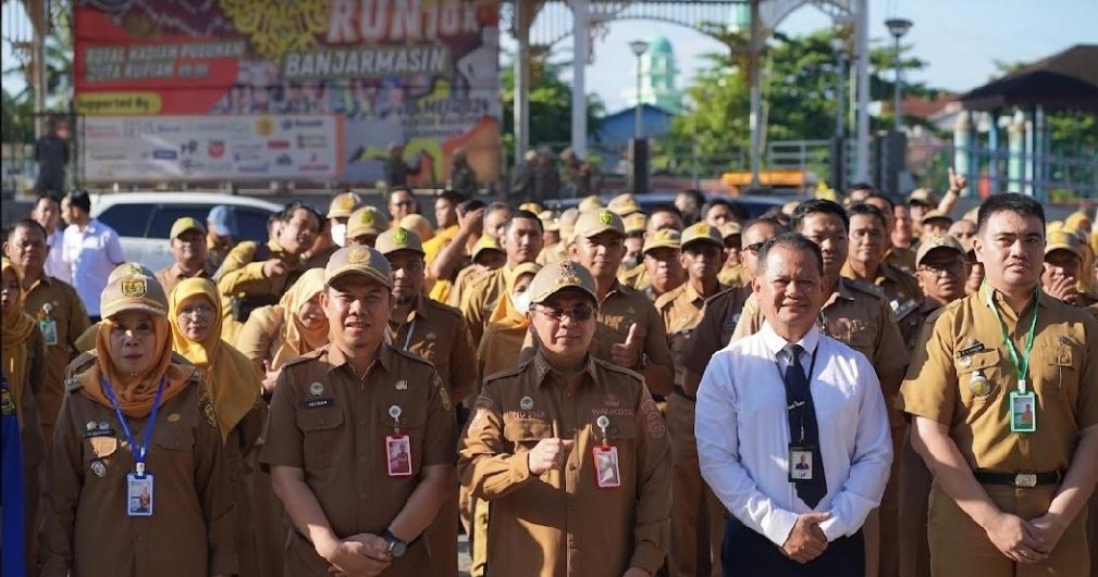 JURNALKALIMANTAN.COM, BANJARMASIN – Pemerintah Kota Banjarmasin menggelar apel pagi yang dipimpin langsung Wali Kota H. Ibnu Sina, dihadiri pimpinan satuan kerja perangkat daerah beserta jajaran, sekaligus penyerahan kartu baru bagi para pegawai, di halaman balai kota, Jalan R.E. Martadinata, Senin (10/06/2024).