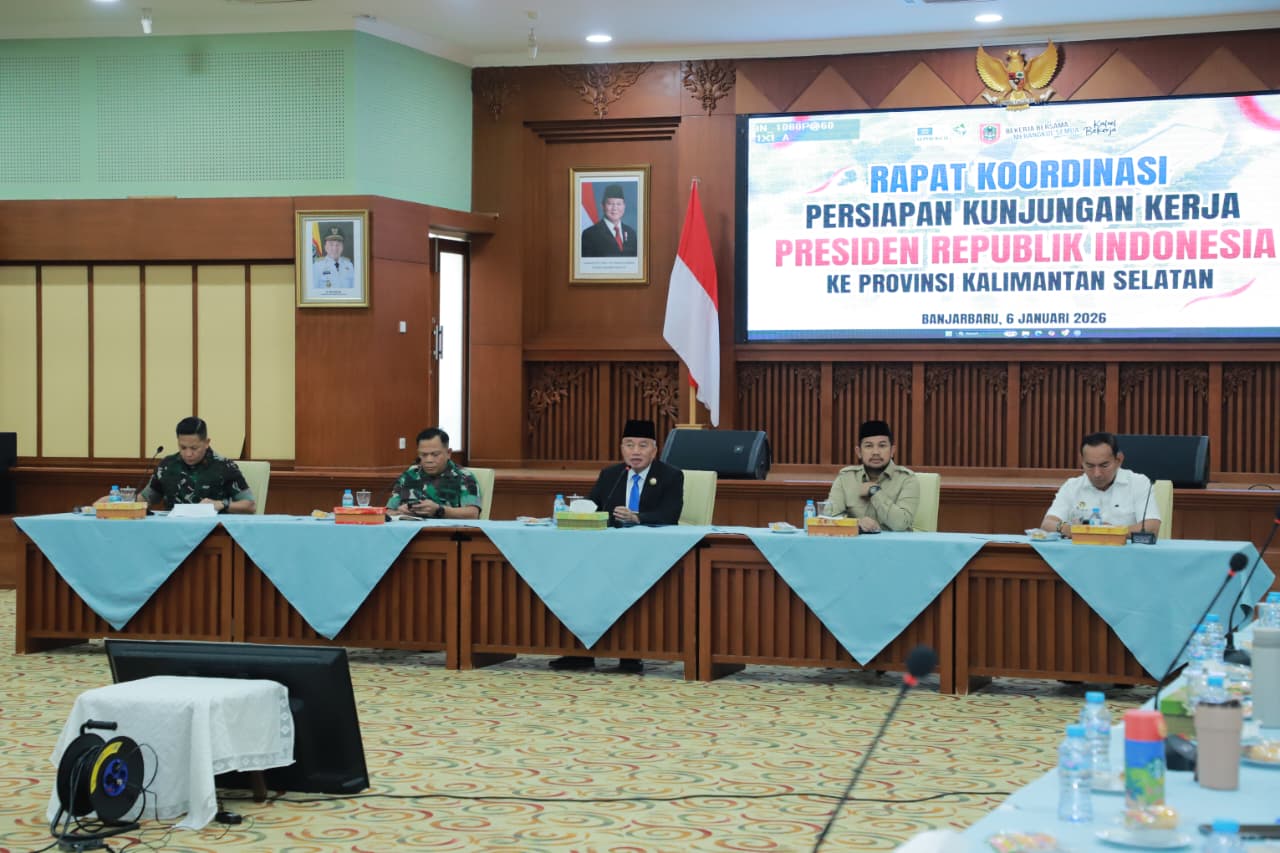 JURNALKALIMANTAN.COM, BANJARBARU – Gubernur Kalimantan Selatan, H. Muhidin, memimpin rapat koordinasi (rakor) persiapan rencana kunjungan kerja Presiden Republik Indonesia, Prabowo Subianto, ke Provinsi Kalimantan Selatan sekaligus kesiapsiagaan menghadapi bencana, Selasa (6/1/2026). Rakor digelar di Aula Idham Chalid, Kantor Gubernur Kalsel, Banjarbaru.