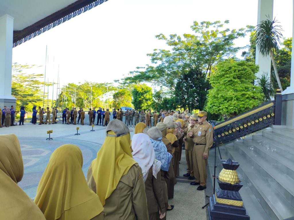 Seusai apel, para pejabat nampak berbaris seraya berjabat tangan dengan para karyawan-karyawati (Sumber md/Adpim).