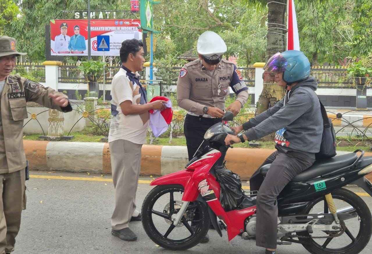 Kegiatan ini turut melibatkan pegawai Kesbangpol serta anggota Purna Paskibraka Indonesia (PPI) Kabupaten HSS, yang ikut turun langsung ke jalan membagikan bendera kepada pengguna jalan.
