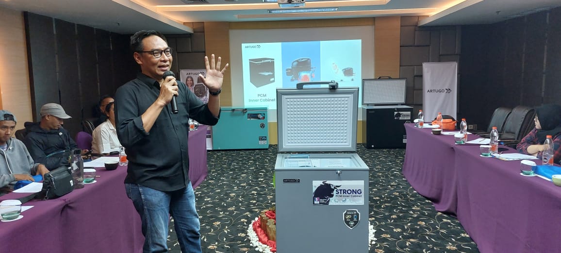 “Kebanyakan chest freezer menggunakan bahan kabinet biasa, hingga tidak kuat menahan beban berton-ton daging. Untuk itu, kita gunakan PCM kuat, sangat kuat, karena bahannya dari besi. Pre-coated metal adalah material istimewa, dan hampir tidak ditemui pada produk sejenis,” ungkapnya di hadapan awak media, Sabtu (2/12/23).