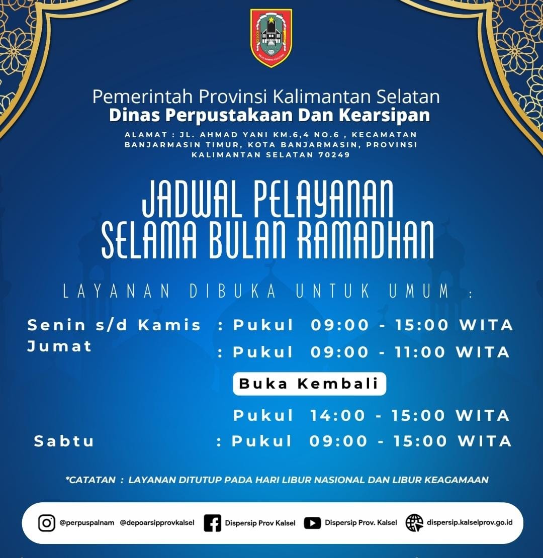 JURNALKALIMANTAN.COM, BANJARMASIN – Perpustakaan Palnam dan Perpustakaan Tendean milik Dinas Perpustakaan dan Kearsipan (Dispersip) Provinsi Kalimantan Selatan, tetap beroperasi selama bulan suci Ramadan 1447 Hijriah/2026 Masehi.