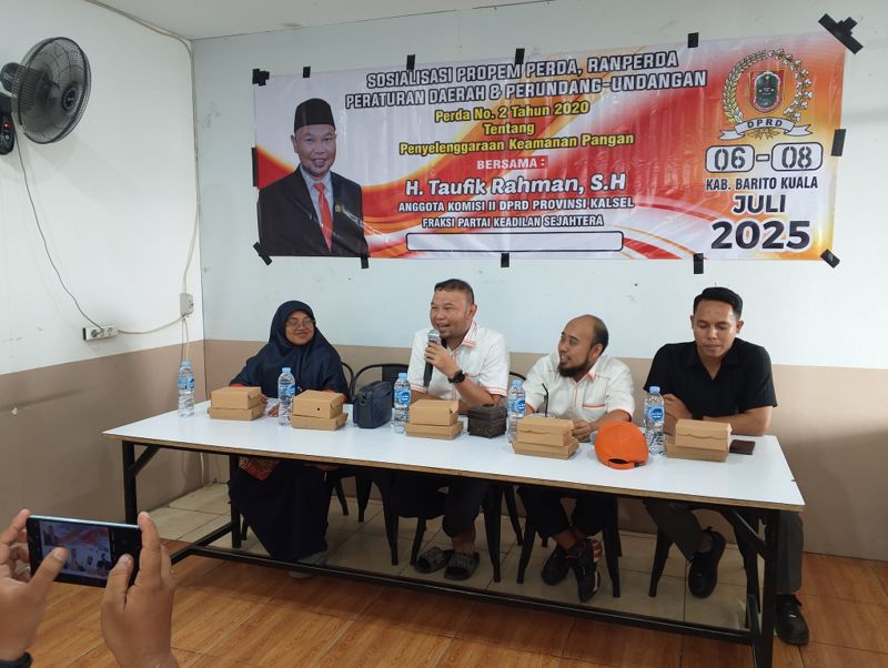 JURNALKALIMANTAN.COM, BARITO KUALA – Anggota DPRD Provinsi Kalimantan Selatan (Kalsel), Taufik Rahman, menyosialisasikan Peraturan Daerah (Perda) Nomor 2 Tahun 2020 tentang Penyelenggaraan Keamanan Pangan di Kecamatan Alalak, Kabupaten Barito Kuala (Batola), kemarin.