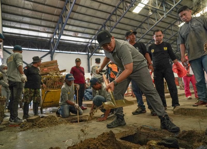 Bupati, H Aulia Oktafiandi memberikan contoh teladan kepada masyarakat dengan gotong royong pembersihan sampah, di Pasar Keramat Barabai, Jum’at (17/5/2024).