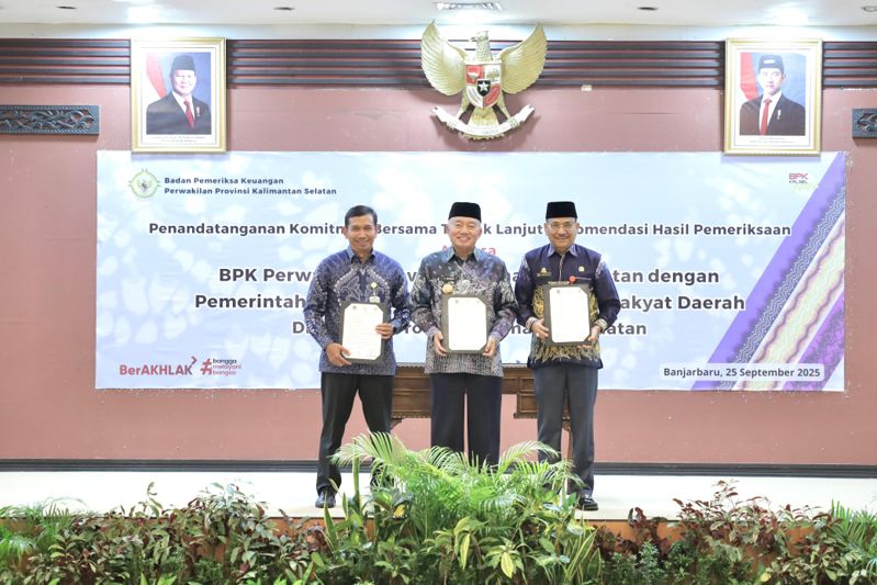 JURNALKALIMANTAN.COM, BANJARBARU – Ketua DPRD Provinsi Kalimantan Selatan Dr. H. Supian HK, SH., MH., bersama Gubernur Kalsel H. Muhidin dan Kepala Perwakilan BPK Kalsel menandatangani komitmen bersama percepatan penyelesaian Tindak Lanjut Rekomendasi Hasil Pemeriksaan (TLRHP) BPK RI, Kamis (25/09/2025) di Aula Gedung BPK RI Perwakilan Kalsel, Banjarbaru.