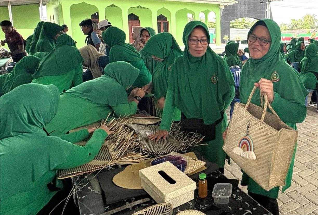 Dalam sesi praktik, anggota Persit terlihat antusias mempelajari teknik menganyam pandan laut menjadi berbagai produk, seperti tas, sandal, hingga tempat tisu.