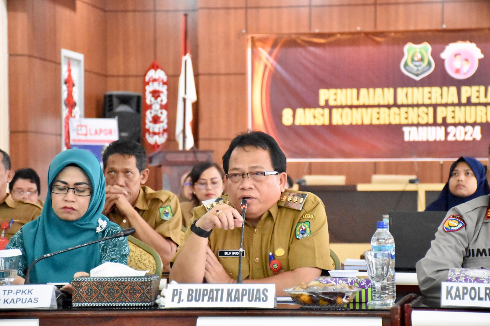 JURNALKALIMANTAN.COM, KUALA KAPUAS – Penjabat Bupati Kapuas, Erlin Hardi, mengikuti kegiatan Penilaian Kinerja Pelaksanaan 8 Aksi Konvergensi Penurunan Stunting Tahun 2024 Secara Daring bersama Tim Percepatan Penurunan Stunting (TPPS) Provinsi Kalimantan Tengah dan 6 Kabupaten/Kota Wilayah Pemerintah Provinsi Kalimantan Tengah di dampingi Pj Ketua TP – PKK Kapuas, Agustina Sri Rejeki, Kepala Dinas Keluarga Berencana, Pemberdayaan Perempuan dan Perlindungan Anak Kabupaten Kapuas, Perwakilan Kapolres Kapuas, Perwakilan Dandim 1011/Kapuas dan Anggota Forkopimda yang tergabung dalam jajaran TPPS serta Kepala Organisasi Perangkat Daerah Terkait, di Aula Bappelitbang Kabupaten Kapuas, Selasa (7/5).