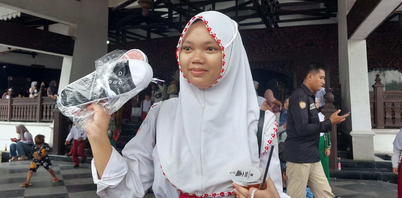 Salah satu penerima bantuan, Mikaila, siswi kelas VI SDN Alalak Utara 1, mengaku senang menerima sepatu baru.