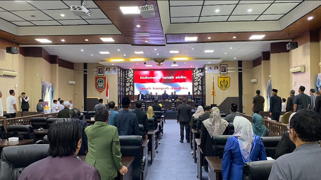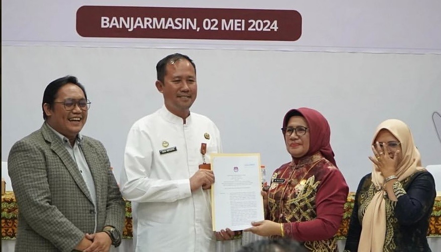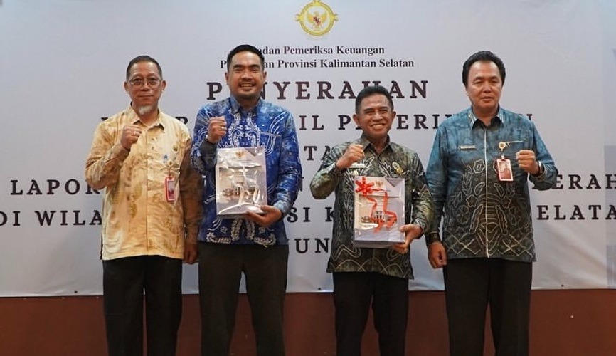 TERIMA LAPORAN: Ketua DPRD Banjarmasin H Harry Wijaya bersama Wakil Walikota Banjarmasin dan didampingi Kepala BPKPAD menerima penyerahan Laporan Hasil Pemeriksaan atas Laporan Keuangan Pemerintah Darah di Wilayah Kalsel Tahun 2023.