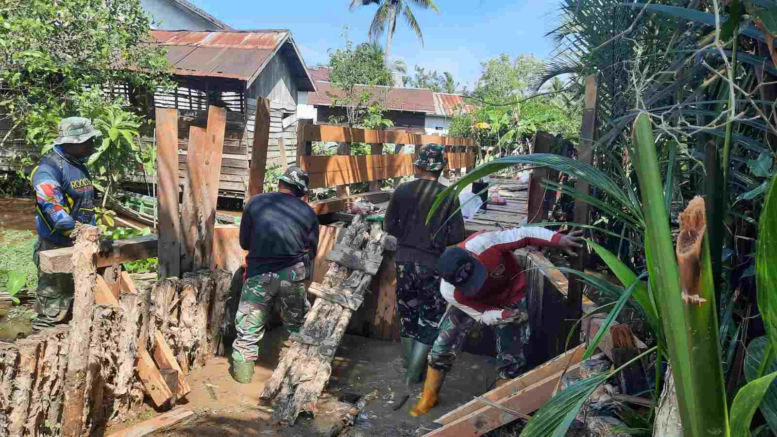 Suasana semangat gotong royong anggota TNI dan warga membangun akses jembatan di lokasi TMMD ke 125. (Foto : ist)