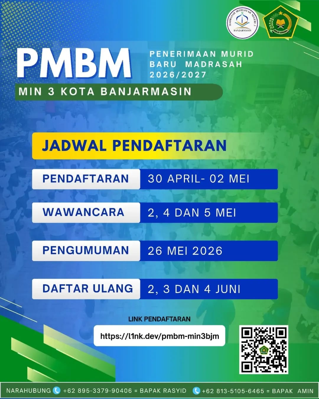 JURNALKALIMANTAN.COM, BANJARMASIN – Penerimaan Murid Baru Madrasah (PNBM) tahun ajaran 2026/2027 di Kota Banjarmasin mulai dibuka. Salah satunya Madrasah Ibtidaiah Negeri (MIN) 3 Kota Banjarmasin yang membuka pendaftaran secara daring, mulai Kamis (30/4/2026).