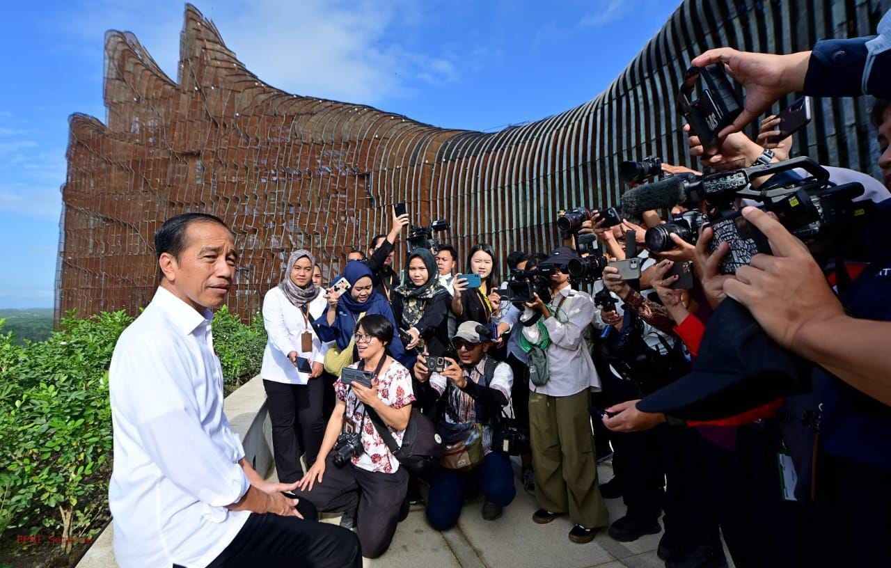 Dalam kesempatan tersebut, Presiden tampak mengajak awak media berkeliling seraya berbincang santai. Presiden mengajak awak media melihat lobi kantor presiden, ruang konferensi pers, hingga plaza pandang (viewing deck). (BPMI Setpres)