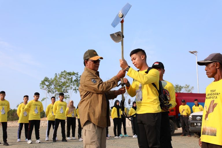Paman Birin pun memakaikan alat mesin potong rumput kepada pasukan Elang Darat Karhutla secara simbolis menandai dimulainya kegiatan tersebut.