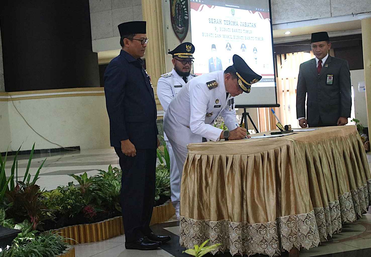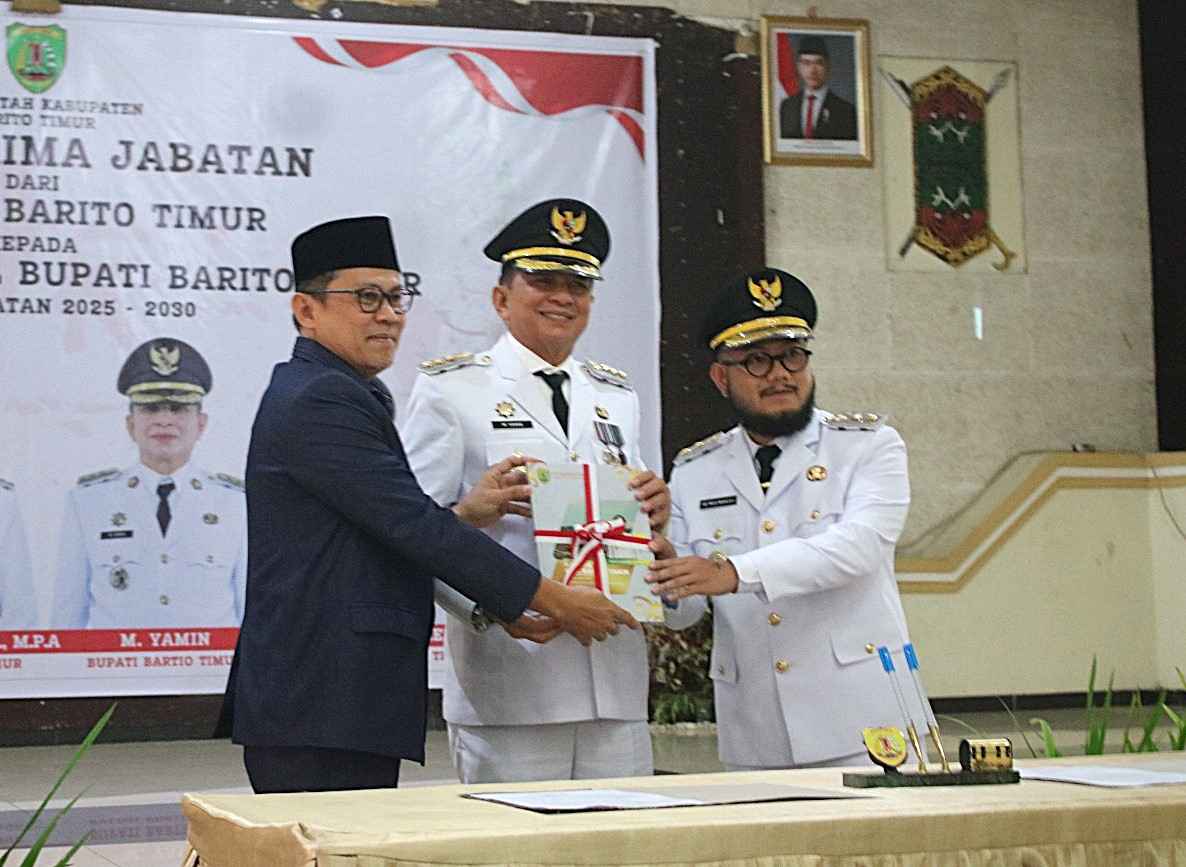 JURNALKALIMANTAN.COM, BARITO TIMUR – Kabupaten Barito Timur memasuki babak baru kepemimpinan setelah Penjabat (Pj.) Bupati Barito Timur Indra Gunawan, secara resmi menyerahkan tongkat estafet pemerintahan kepada Bupati definitif M. Yamin dan Wakil Bupati Adi Mula Nakalelu. Prosesi serah terima jabatan (sertijab) yang digelar di Gedung Pertemuan Umum Mantawara, Rabu (5/3), menjadi momentum penting yang menandai dimulainya masa kerja pemerintahan baru.