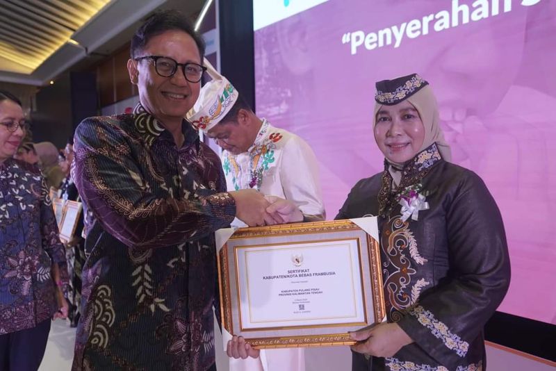 Sertifikat bebas frambusia diserahkan langsung oleh Menteri Kesehatan RI, Budi Gunadi Sadikin, kepada Penjabat Bupati Pulang Pisau, Nunu Andriani, dalam peringatan Hari Neglected Tropical Diseases (NTD) Sedunia, di Jakarta, Rabu (06/03), bersamaan dengan sertifikat eliminasi penyakit kaki gajah atau filariasis.