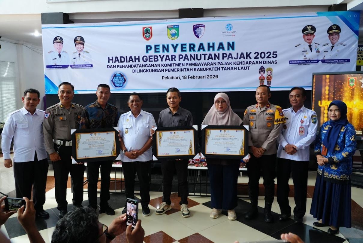 JURNALKALIMANTAN.COM, TANAH LAUT – Komitmen mengoptimalkan Pendapatan Asli Daerah (PAD) terus diperkuat Pemerintah Kabupaten Tanah Laut bersama UPPD Samsat Pelaihari. Melalui ajang Gebyar Panutan Pajak Kendaraan Bermotor (PKB) Tahun 2025, apresiasi diberikan kepada para wajib pajak teladan dalam acara penyerahan simbolis hadiah utama yang digelar di Kantor Samsat Pelaihari, Rabu (18/02/2026).