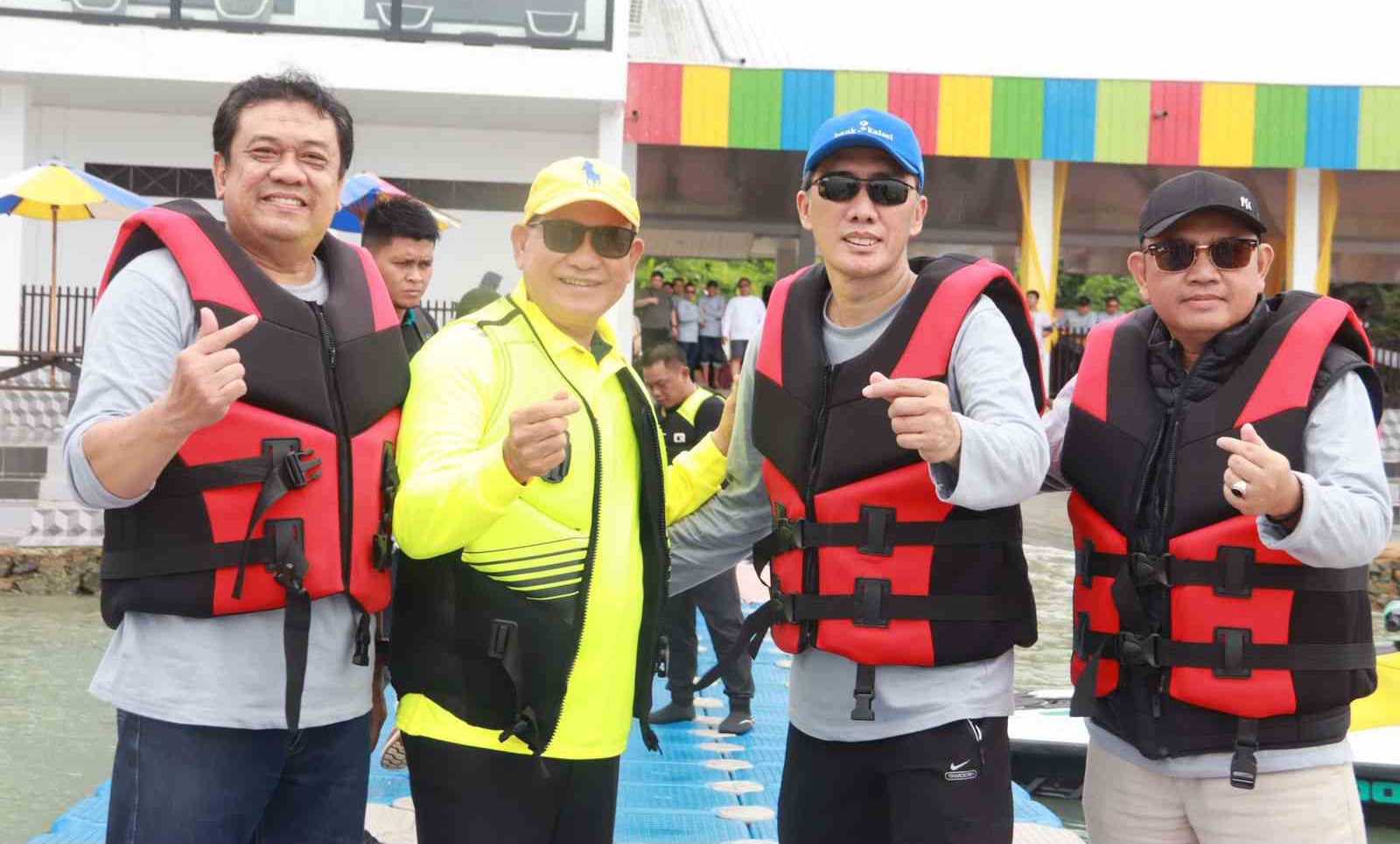 Kehadiran rombongan para pimpinan Bank Kalsel beserta keluarga dan staf disambut Bupati Kotabaru, Sayed Jafar bersama Ketua TP-PKK, Kepala SKPD di objek wisata Jetsky Teluk Masjid, Desa Teluk Masjid, Kecamatan Pulau Laut Timur, Kabupaten Kotabaru, Sabtu (8/7/2023).