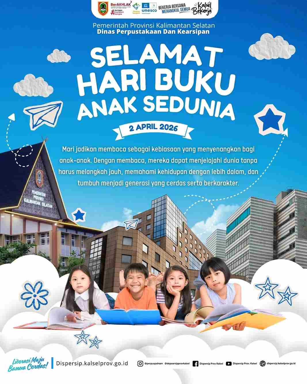 JURNALKALIMANTAN.COM, BANJARMASIN – Dinas Perpustakaan dan Kearsipan (Dispersip) Provinsi Kalimantan Selatan, menyampaikan selamat ucapan Hari Buku Anak Sedunia yang jatuh pada 2 April 2026, dengan mengajak masyarakat untuk menumbuhkan budaya literasi sejak usia dini.