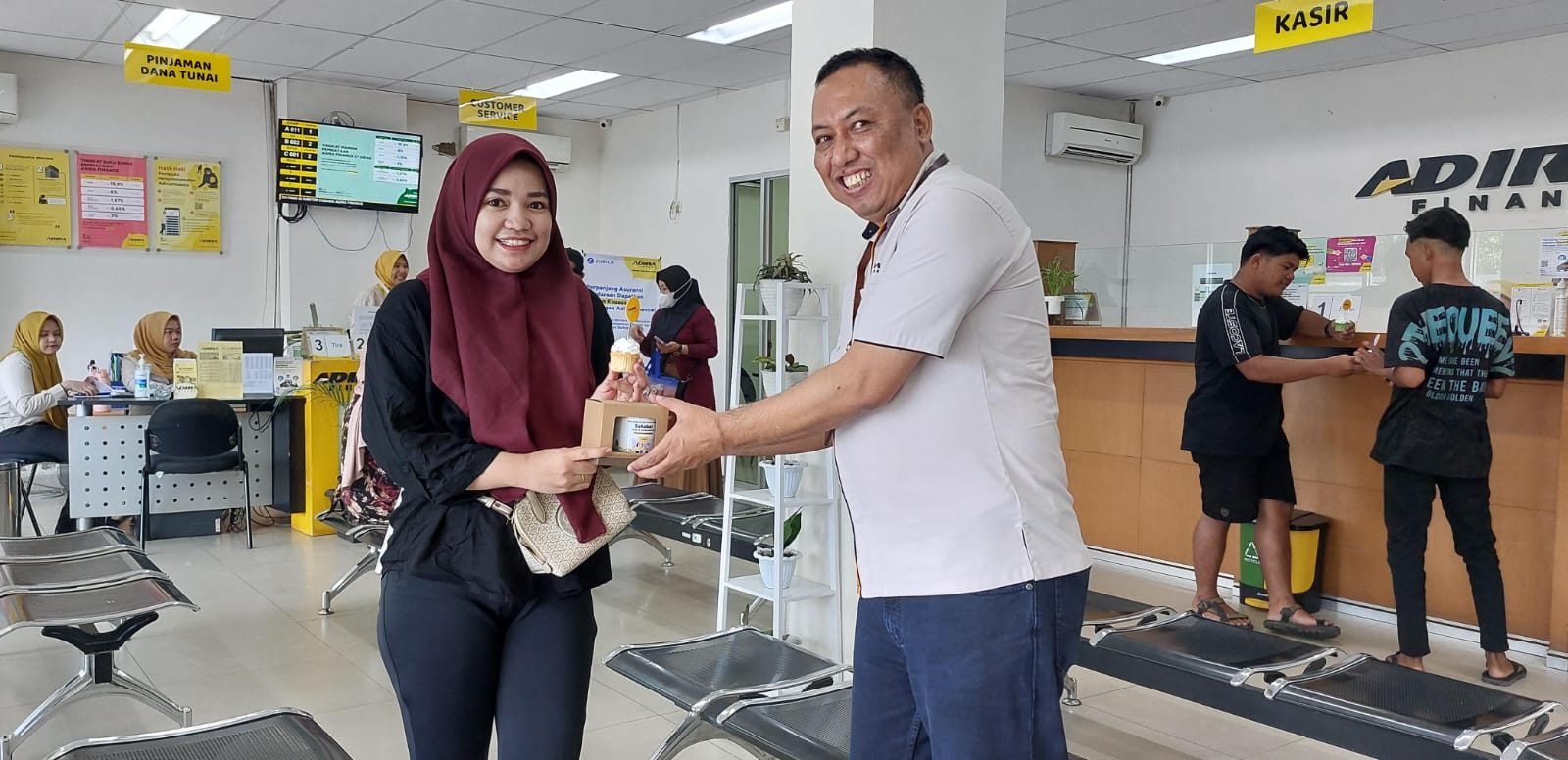 Pada kesempatan ini, Head of Branch Sales Sevice Distribution Adira Finance Cabang Banjarmasin Winarno, juga langsung ikut melayani, hingga memberikan makanan kecil dan suvenir, sebagai bentuk terima kasih atas kepercayaan kepada Adira.