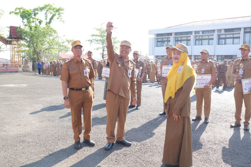 Penghargaan diserahkan kepada 3 SKPD, yakni Dinas PUPR, Satpol PP, Bappelitbang, serta 3 Kecamatan yaitu Marabahan, Mandastana dan Rantau Badauh, usai kegiatan apel, di halaman Pemkab Barito Kuala, Senin (16/10/23).