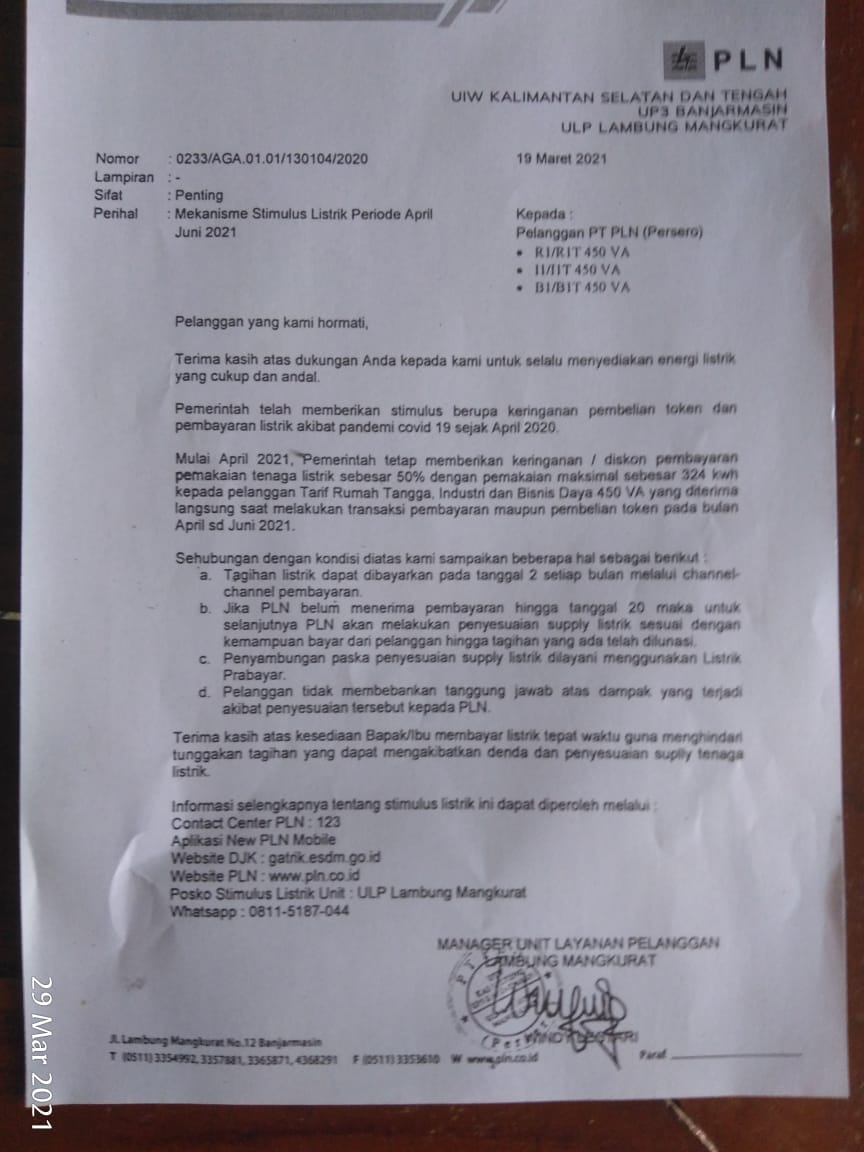 Dalam surat tersebut dijelaskan terkait keringanan pembelian token dan pembayaran listrik akibat pandemi Covid-19 sejak April 2020, yang kemudian dilanjutkan lagi di tahun ini, dengan pemberian diskon atau keringanan pembayaran pemakaian tenaga listrik ataupun pembelian token listrik dengan persyaratan yang sudah ditentukan.