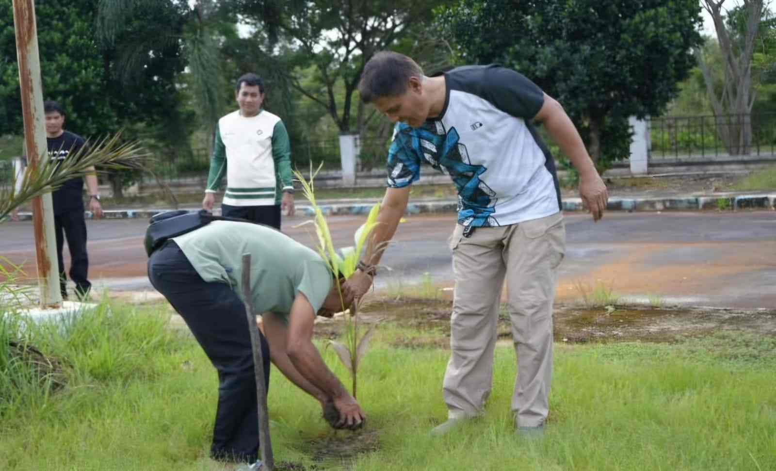 Mereka bersama-sama membersihkan halaman, merapikan taman, serta menanam berbagai jenis tanaman dan pohon di lingkungan kantor.