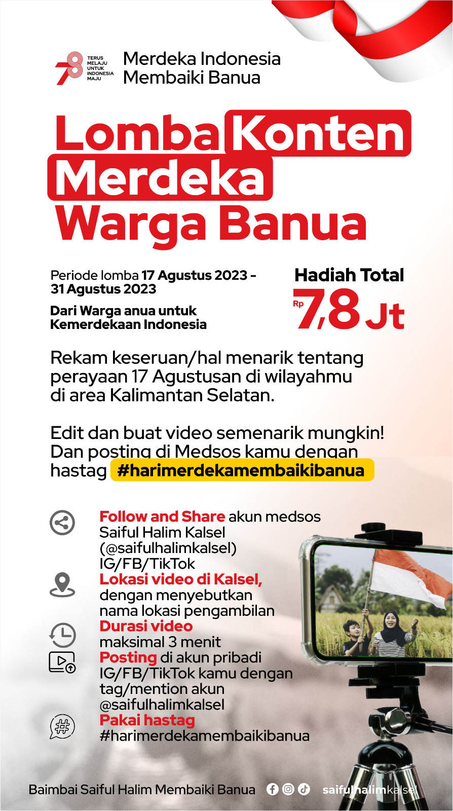 Syaratnya antara lain mengikuti dan membagikan akun Media Sosial Saiful Halim, lokasi acara di Kalsel, durasi maksimal 3 menit, dan diposting di akun pribadi, dengan mengetag akun Saiful Halim, serta memakai tagar #harimerdekamembaikibanua. Hadiah yang dipersembahkan total senilai Rp7,8 juta.
