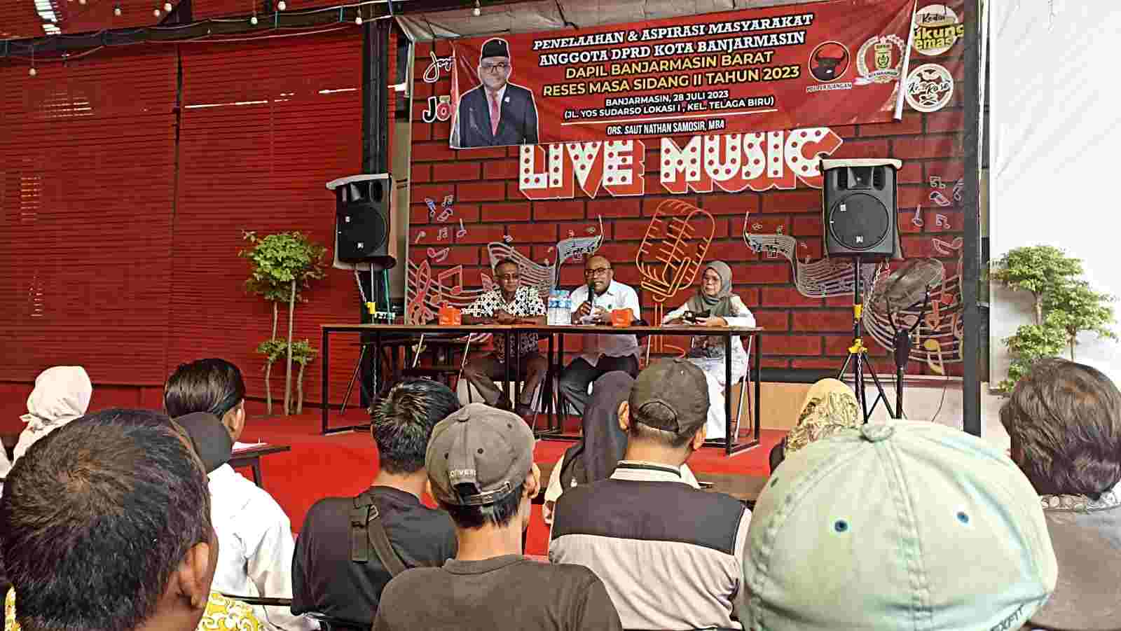 JURNALKALIMANTAN.COM, BANJARMASIN – Satu persatu warga Kelurahan Basirih, Kecamatan Banjarmasin Barat, berdatangan ke Kedai 99 Trisakti, Jalan Yos Sudarso. Mereka pun diberi kesempatan Saut Nathan Samosir, Ketua Komisi IV DPRD Banjarmasin dari Fraksi Partai Demokrasi Indonesia Perjuangan (PDIP) untuk menyampaikan aspirasi.
