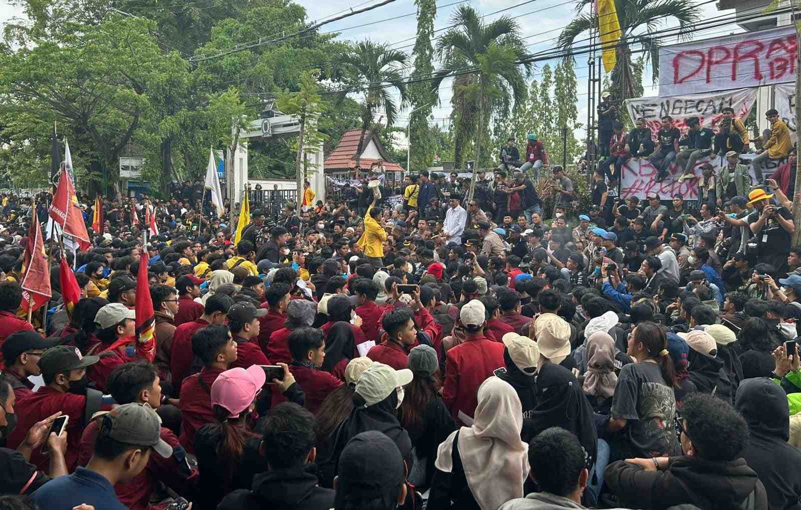 Mereka memenuhi jalan di depan gedung DPRD, sambil membawa spanduk, bendera, serta berbagai atribut aksi unjuk rasa.