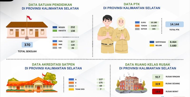 Berdasarkan data, terdapat 370 satuan pendidikan di Kalsel yang terdiri dari 232 sekolah negeri dan 138 swasta, dengan rincian 217 SMA, 128 SMK, dan 26 SLB. Dari sisi tenaga pendidik, tercatat 14.144 PTK, namun sebanyak 5.680 di antaranya belum tersertifikasi.