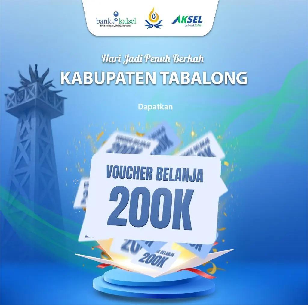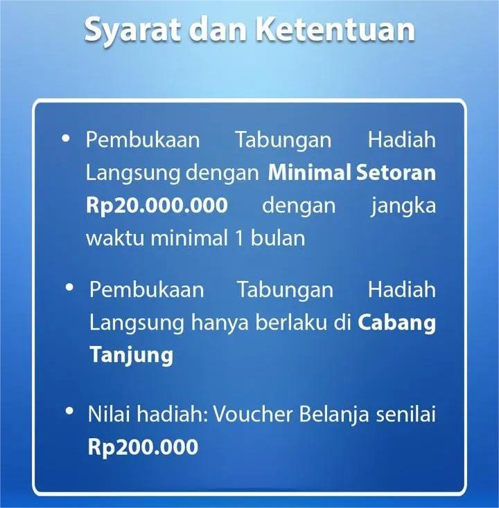 Sebagai bentuk apresiasi, Bank Kalsel menghadirkan promo Voucher Belanja senilai Rp200.000 bagi nasabah yang membuka Tabungan Hadiah Langsung dengan jangka waktu minimal 1 bulan dan setoran penempatan minimal Rp20.000.000 (syarat dan ketentuan berlaku). Program ini berlangsung pada 1–15 Desember 2025.