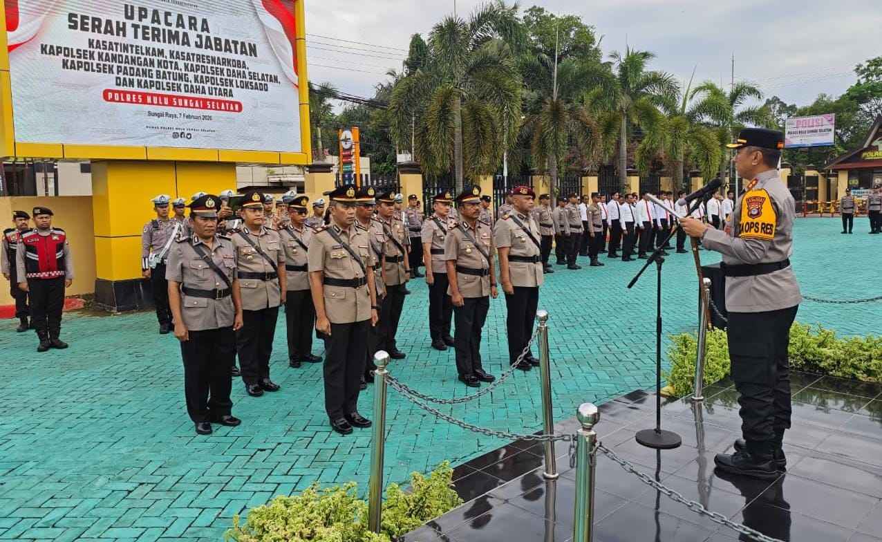 JURNALKALIMANTAN.COM,HULU SUNGAK SELATAN – Kepolisian Resor (Polres) Hulu Sungai Selatan (HSS) melakukan rotasi dan penyegaran jabatan sebagai bagian dari penguatan kinerja organisasi dan peningkatan kualitas pelayanan kepada masyarakat. Hal tersebut ditandai dengan pelaksanaan Upacara Serah Terima Jabatan (Sertijab) sejumlah pejabat utama dan kapolsek jajaran, di halaman Mapolres, Sabtu (7/2/26).